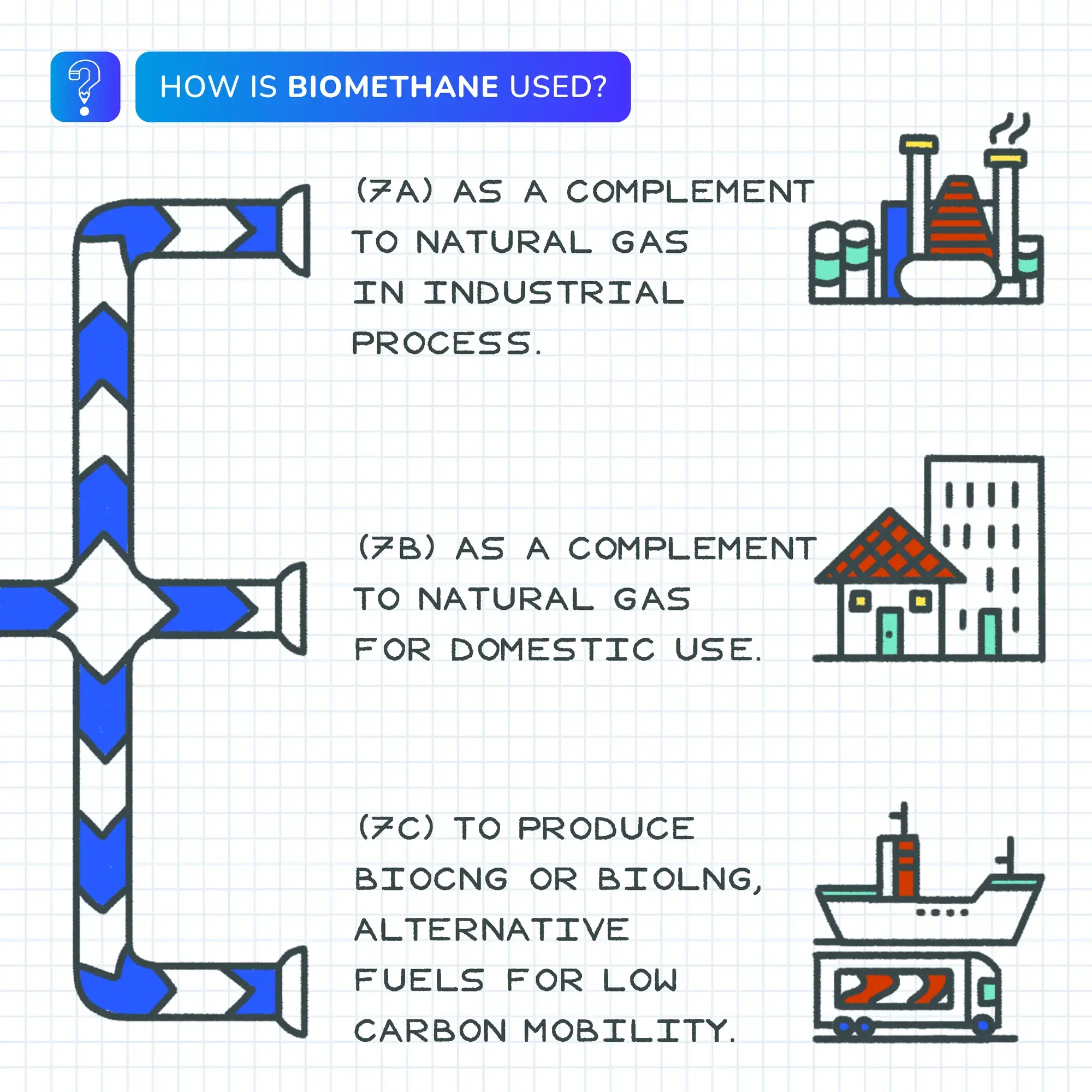 Because biomethane has the same characteristics as natural gas, it can be used for the same applications, including transport and small-scale industrial use.